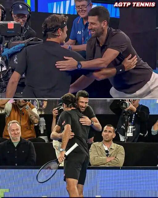 故人重逢,江湖已远, 当费德勒跑过去场边与德约科维奇拥抱时, 全场的目光都为之驻足。