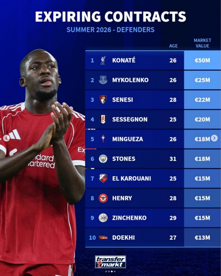2月23日讯 德转列今夏合同到期十大后卫球员身价,科纳特5000万欧居首。